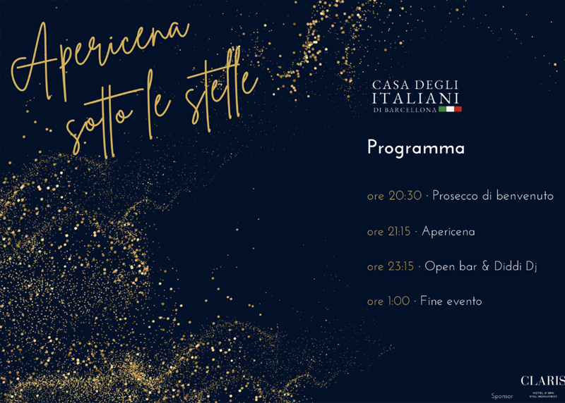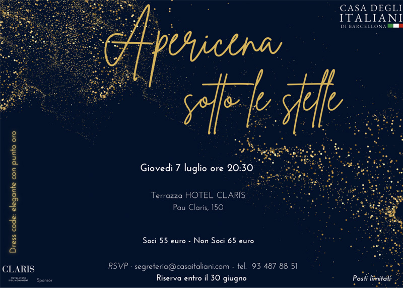 Us informem amb molt de gust que, el dijous 7 de juliol a les 20:30h, hi haurà la nostra "Apericena sota les estrelles" a la Terrassa de l'HOTEL CLARIS al C/ Pau Claris nº 150. Un lloc exclusiu per passar una vetllada memorable junts, sota la llum de les estrelles.