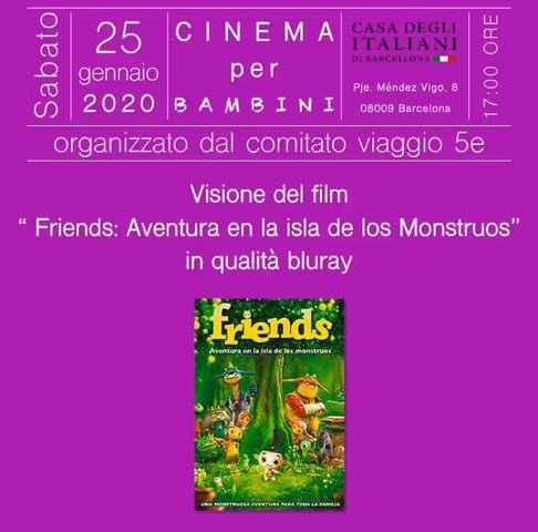 Inizia il cinema per bambini qui alla Casa degli Italiani, organizzato dal comitato viaggio quinte della Scuola Italiana di Barcellona. Sabato 25 Gennaio dalle ore 17:00 sarà proiettato il film “Friends: Aventura en la isla de los Monstruos” in qualità bluray.