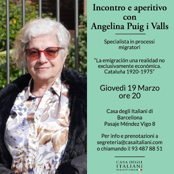 Alla Casa degli Italiani si svolgerà un incontro, e subito dopo un aperitivo, con Angelina Puig i Valls specialista in processi migratori. La ricercatrice ci parlerà dell’emigrazione come fenomeno non esclusivamente economico, analizzando il caso della Catalogna dal 1920 al 1975. Per info e prenotazioni potete contattare la nostra Segreteria scrivendo a segreteria@casaitaliani.com o chiamando il 93 487 88 51.