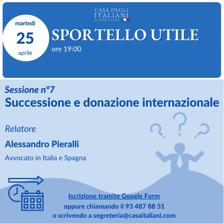 La setena cita de l'Sportello Utile, dimarts 25 d'abril a les 19 h, se centrarà en "Successió i donació internacional" a càrrec de l'advocat Alessandro Pieralli.