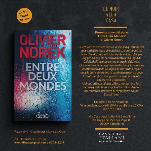Alla Casa degli Italiani di Barcellona, giovedì 19 Marzo alle ore 12:00 e alle ore 19:00, sarà moderato da Anne Sophie un Club di lettura intorno al giallo bestseller “Entre deux mondes” di Olivier Norek, tutto in lingua francese.