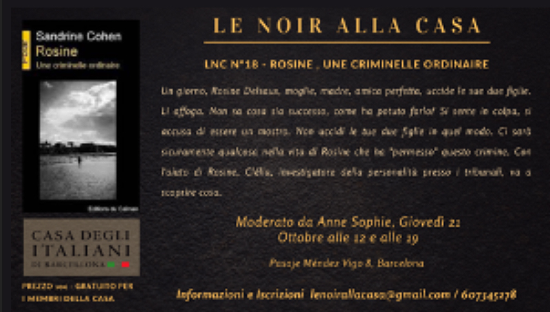 Giovedì 21 ottobre alle ore 12:00, in forma online, si svolgerà il diciottesimo appuntamento di Le Noir alla Casa ma, questa volta, sarà presente anche la scrittrice Sandrine Cohen che, con il libro “Rosine, une criminelle ordinaire”, ha vinto il Gran premio francese di letteratura poliziesca 2021.