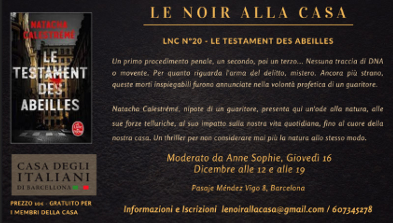 Questo mese, Le Noir alla Casa vi dà appuntamento giovedì 16 dicembre in due sessioni, ore 12 e ore 19, per la ventesima edizione del club del libro LNC, con un thriller che non vi farà considerare mai più la natura allo stesso modo: “Le Testament des Abeilles” di Natache Calestrémé.
