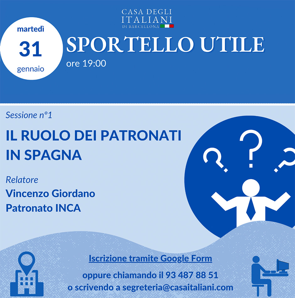 Martedì 31 gennaio ore 19 prima sessione Sportello Utile “Il Ruolo dei Patronati in Spagna”
