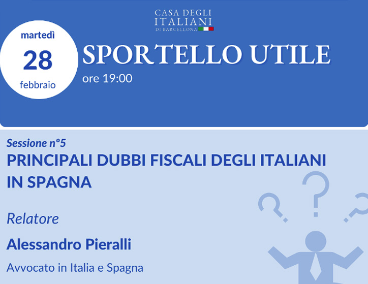 Quinto appuntamento dello Sportello Utile, martedì 28 febbraio ore 19, sarà incentrato su “Principali dubbi fiscali italiani in Spagna” a cura dell’avvocato Alessandro Pieralli.