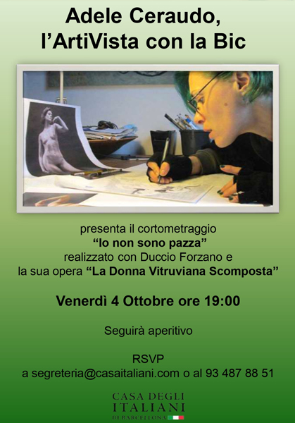 Il 4 Ottobre la Casa degli Italiani ospita "Adele Ceraudo, l'ArtiVista con la Bic". Si presenterà il cortometraggio realizzato con Duccio Forzano "Io non sono pazza" e la sua opera "La Donna Vitruviana Scomposta". L’artista si distingue per la sua tecnica unica e riconoscibile, il disegno con la penna Bic con la quale va oltre ogni immaginazione e ha ritratto illustri personaggi, tra cui: Rita Levi Montalcini, Lina Wertmuller, Josefa Idem, Irene Pivetti.