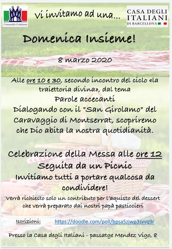Siete tutti invitati l'8 Marzo alle ore 10:30 per la Domenica Insieme versione Picnic che si terrà qui alla Casa degli Italiani di Barcellona. Potete iscrivervi tramite il link doodle: https://doodle.com/poll/44xsc62rrxgkgpmr indicando accanto al vostro nome, oppure utilizzando l'opzione "commenti", il vostro: